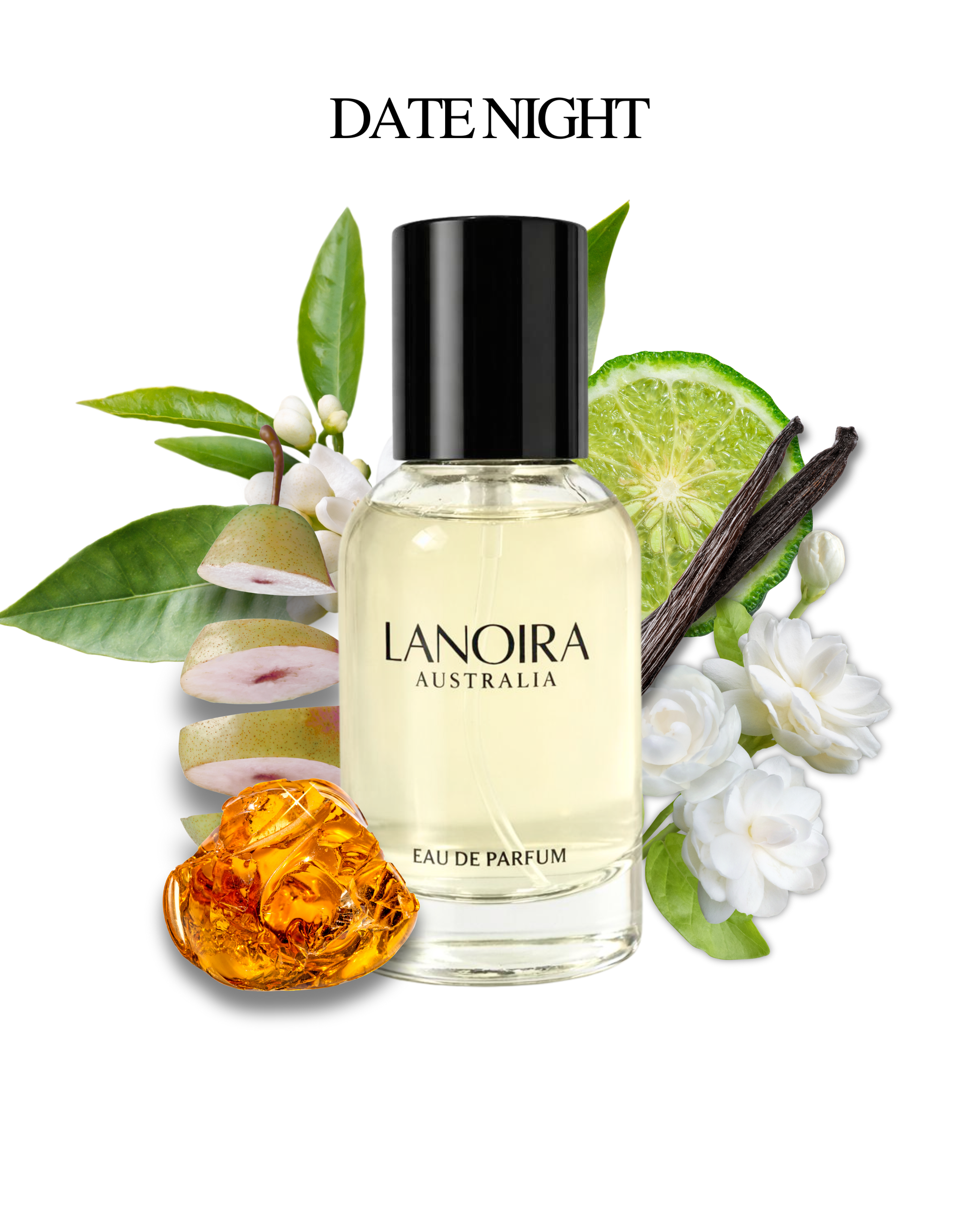 Date Night, inspired by Prada's Paradoxe Intense, opens with juicy pear and sparkling citrus, neroli and bergamot, that instantly lift the mood. At its heart, fresh jasmine and earthy moss mingle with a hint of neroli, creating a lively floral-green blend. The fragrance finishes warm and sweet with creamy bourbon vanilla, glowing amber, and soft musk, leaving a lasting impression thatβs both playful and refined.